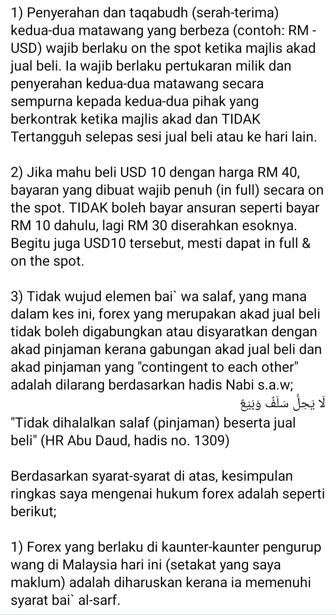 Ya semua sedia maklum Muzakarah Majlis Fatwa Kebangsaan MJFK 2012 putuskan hukum trading forex secara individu adalah haram tetapi melalui bank adalah HARUSJadi hujah matawang tak boleh didagangkan dah tak terpakai. Kami faham ada yang berhenti kerja kerana main forex.